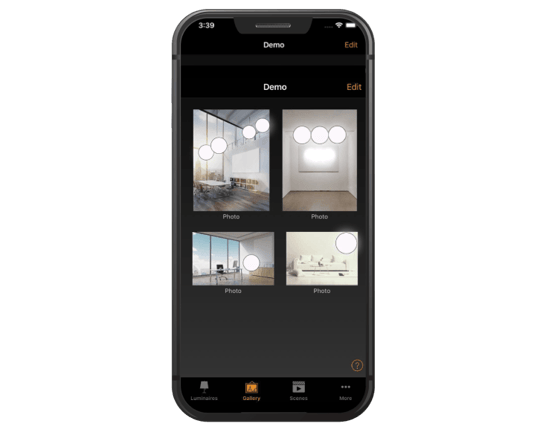 La aplicación emplea un control de gestos intuitivo: toca una luminaria para encenderla o apagarla, desliza el dedo de lado a lado para ajustar el brillo, hacia arriba y hacia abajo para la temperatura del color o mantén presionado para cambiar el color. La exclusiva función de galería incluso permite a los usuarios cargar sus propias fotos del espacio, marcar las posiciones de las luminarias y usar esto para seleccionarlas y controlarlas.