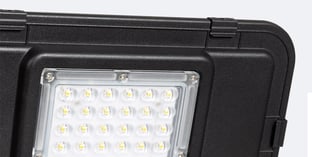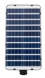 Cuerpo de fundición de aleación de aluminio con alta capacidad de disipación térmica y con panel solar monocristalino de alta eficiencia ocupando toda la superficie de la planta superior de la luminaria.